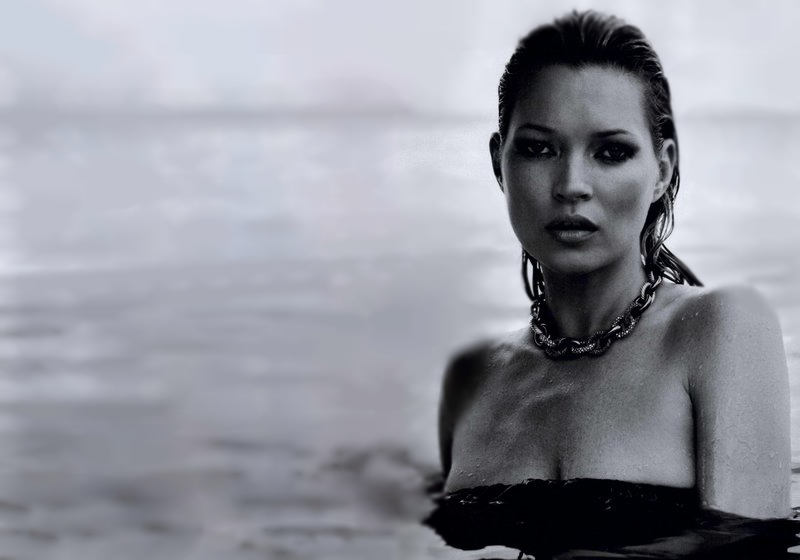 Модель Кейт Мосс запечатлена на фотографии, демонстрируя идеальное сочетание стройности и пленительной женственности.