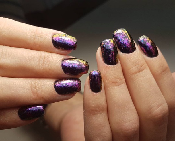 Дизайн ногтей с хлопьями юки отлично сочетается с лаконичным и простым гель-лаком, создавая контраст и привлекательность.