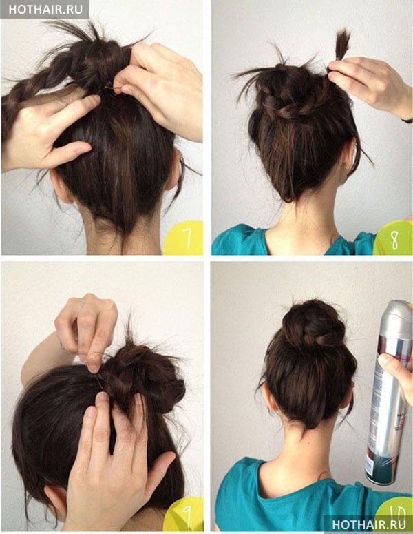 Разделите волосы на две части и сделайте две пучковые косы в стороны. Затем соберите оставшиеся волосы в пучок на затылке и закрепите его невидимками.