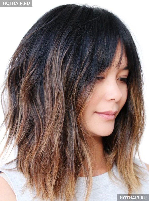 Рваная стрижка на средние волосы с прямой челкой